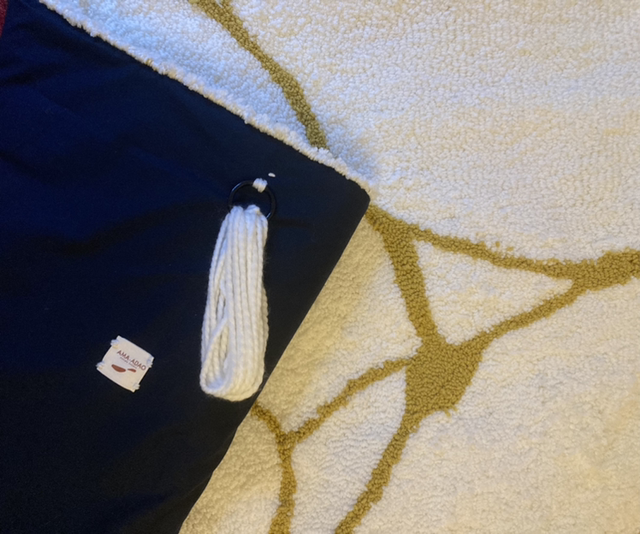 8400 mètres de laine EKO ont été utilisés afin de rendre ce tapis épais, doux et tuftés en Loop. Sa douceur et son équilibre apportent une énergie de paix. Le tapis est doublé en coton bleu marine et cousu entièrement à la main.